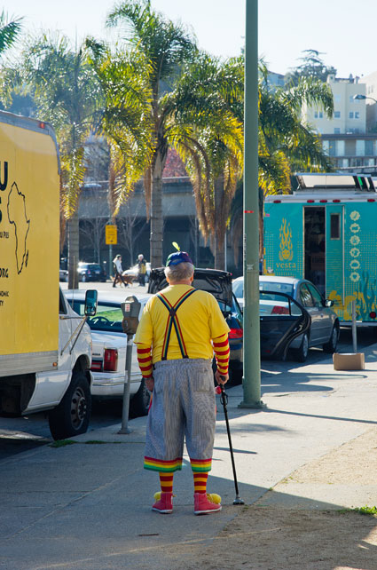 Off to breakfast and the papers, the sky clear, the sun bright, the light nice. I took the picture above walking over to the market after breakfast (still had time left on the meter) and took the picture. There was a sign at his workstation saying today was his eightieth birthday. Eighty years. Scary. Indeed. Still, what the hell? Eighty years in the life of a clown. We're all clowns. Best to celebrate.