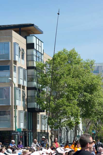 Later indeed. A walk. Yes, there was a break, clearly a danger the break wouldn't last, but the intrepid photographer set forth, taking a picture at the bus stop, the sky dicey. A walk then after getting off the bus at an earlier than my normal stop, walking over to Telegraph and entering Frank Ogawa Plaza from the south, the sun now bright and the air clear, a picture just to celebrate. Another of the entrance to City Hall, the tile work leading into it catching my eye; again, the recent rain and clear air making the difference.